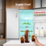 Thoughtful touches make a real difference. The multi-use beverage tray holds wine bottles, fizzy drinks, or snacks neatly, so nothing rolls around when you open the door. For taller bottles, the XXL balcony storage steps in, comfortably holding milk cartons, juice, or a couple of rows of cans. Inside, there’s a balance of shelves and drawers, giving you the flexibility to organize things exactly as you like.